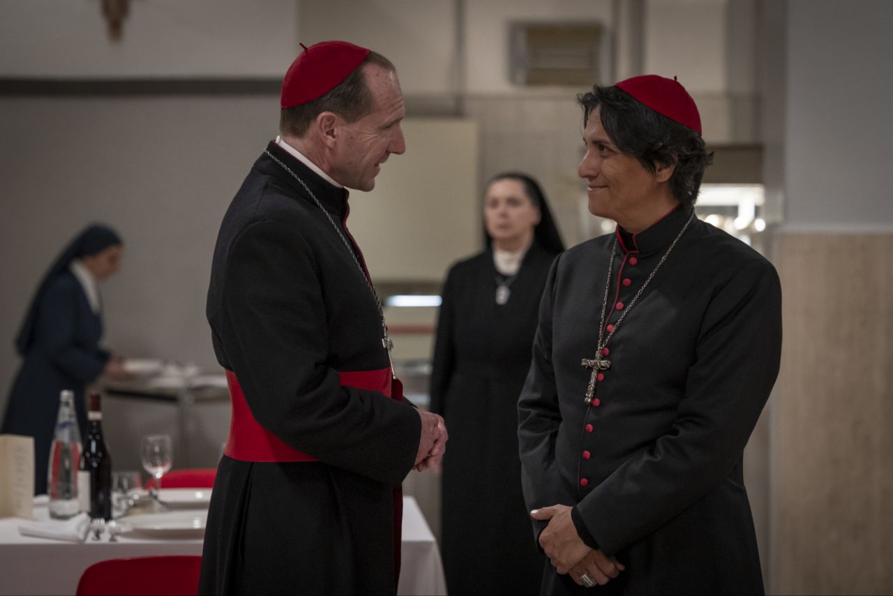 Серед акторського складу: Рейф Файнс, Стенлі Туччі, Джон Літгоу, Серджіо Кастелліто. Вони втілюють амбітних та запеклих до боротьби церковних кардиналів та Ізабелла Росселліні – тиха і ледь помітна спостерігачка ігрищ – монахиня Агнес. Особливо вражає, як у діалогах передається напруга, яка кипить під поверхнею дипломатичної стриманості, що де-не-де приправлена духом сучасності, адже ці кардинали покурюють цигарки та користуються гаджетами. Неспішний плин історії кіно варто окремо відзначити, адже попри анонс фільму та зазначеного жанру, не варто чекати від картини екшену чи динамічності. Тут увагу глядача зосереджують на візуальному втіленні історії та розмовах, що відкривають двері у потаємні світи героїв та світобудови церкви.