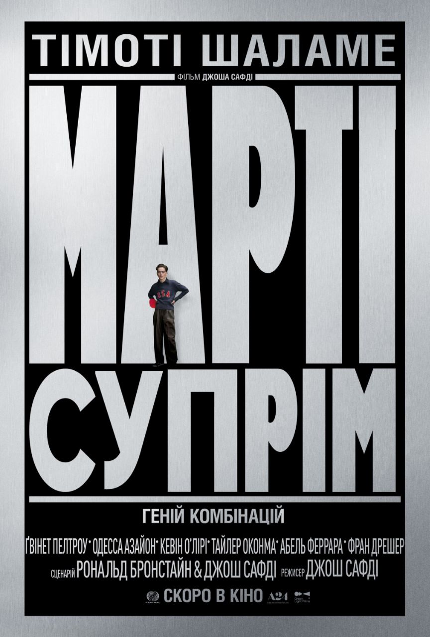 Компанія Green Light Films представила перший трейлер та постер спортивної трагікомедії «Марті Супрім. Геній комбінацій» (Marty Supreme), головну роль у якій виконав двічі номінант на премію «Оскар» Тімоті Шаламе («Дюна», «Вонка», «Боб Ділан: Цілковитий незнайомець»).