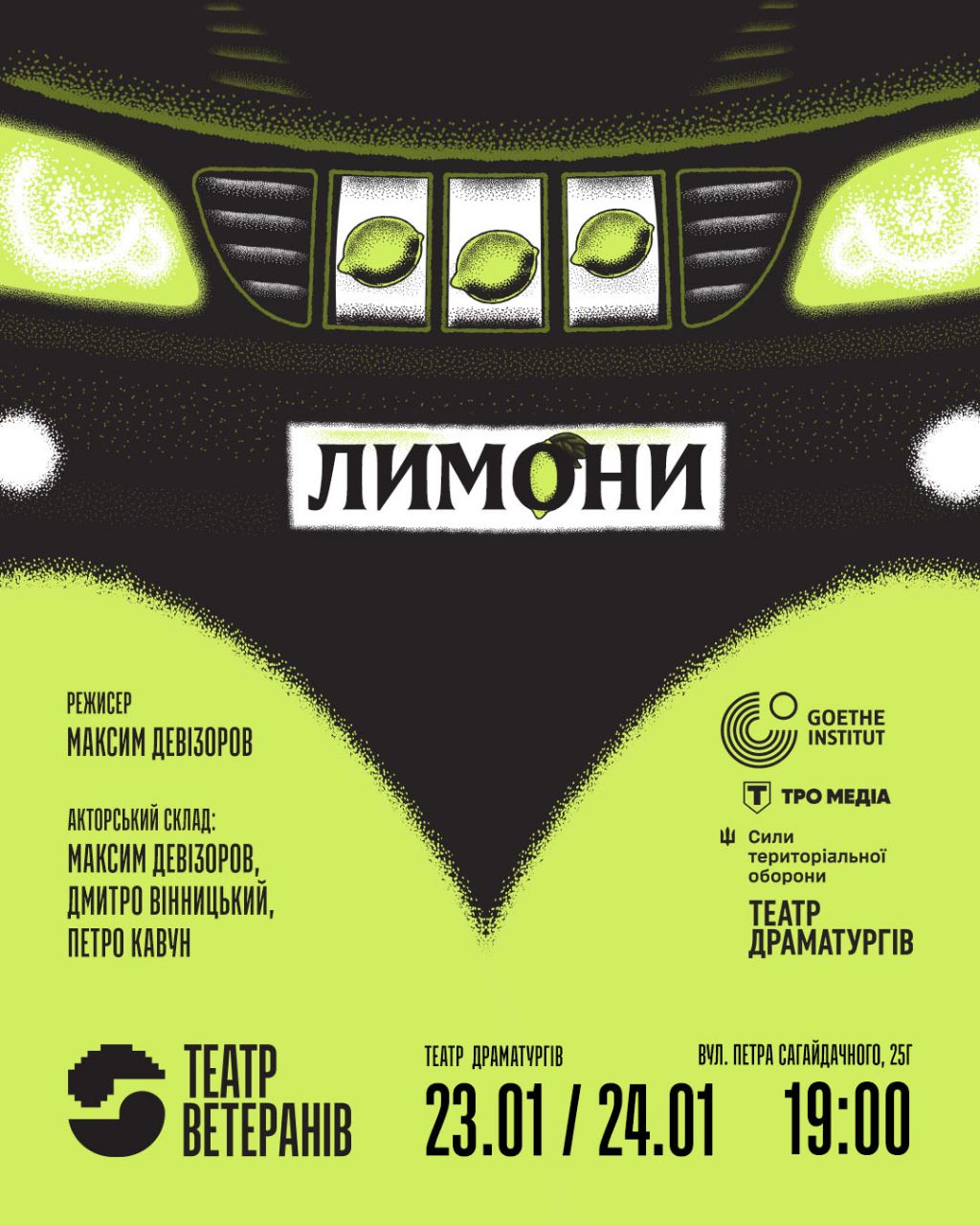 23–24 січня у Театрі Драматургів відбудеться прем'єра вистави «Лимони» Театру Ветеранів. Початок обох показів о 19:00.