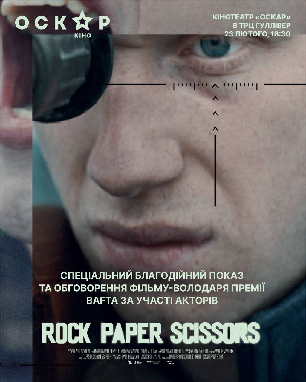 У київському ТРЦ Gulliver 23 лютого пройде благодійний показ британського короткометражного фільму «Камінь, ножиці, папір» за участі акторів Олександра Рудинського, Сергія Калантая та Юрія Радіонова.